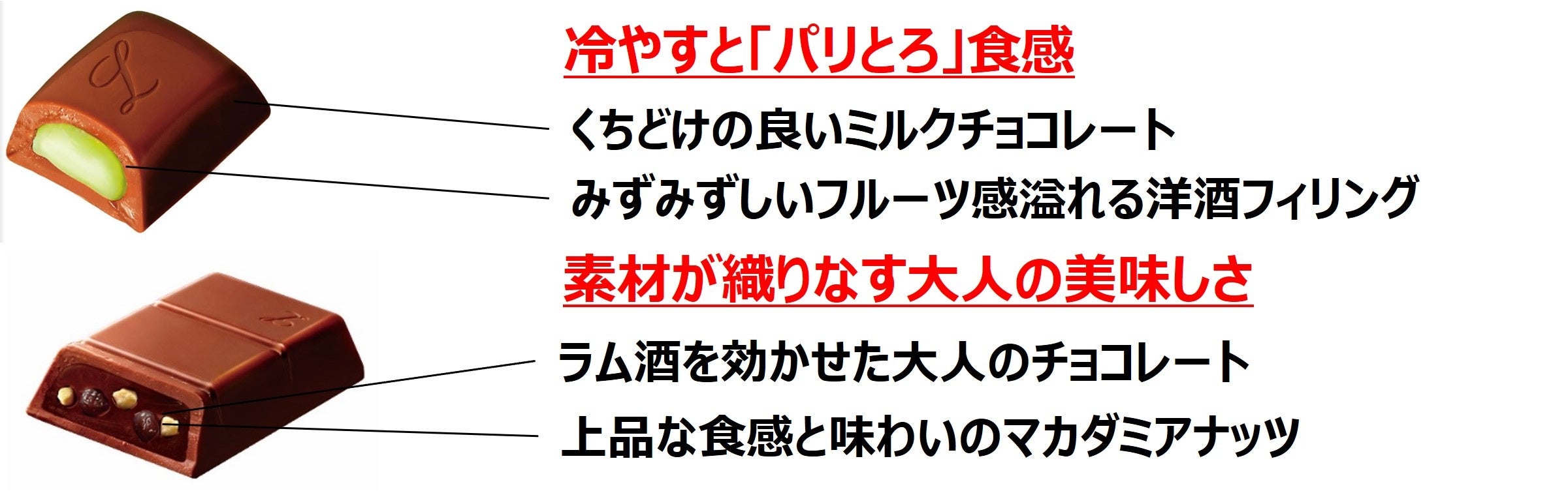 株式会社ロッテは3月14日(火)に、大人の洋酒チョコレート『マスカットリキュール』 『チェリーリキュール』 『ナッツ&レーズン』を発売いたします。 『マスカットリキュール』 『チェリーリキュール』はとろっとした食感が楽しめる粒タイプ、 『ナッツ&レーズン』は洋酒チョコレートにナッツが入ることで新たな美味しさを楽しめるバータイプです。この季節だけの味わいが楽しめる洋酒チョコレートで優雅な気分と贅沢な時間をお楽しみください。