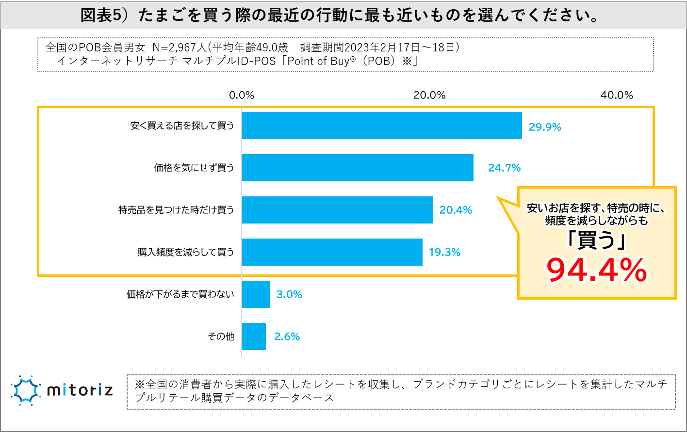 株式会社mitoriz(本社:東京都港区、代表取締役社長:木名瀬博)は、消費者購買行動レポートデータサービス「Point of Buy®(以下、POB)」の会員2,967人に「たまごの値上げに関する調査」を実施致しました。