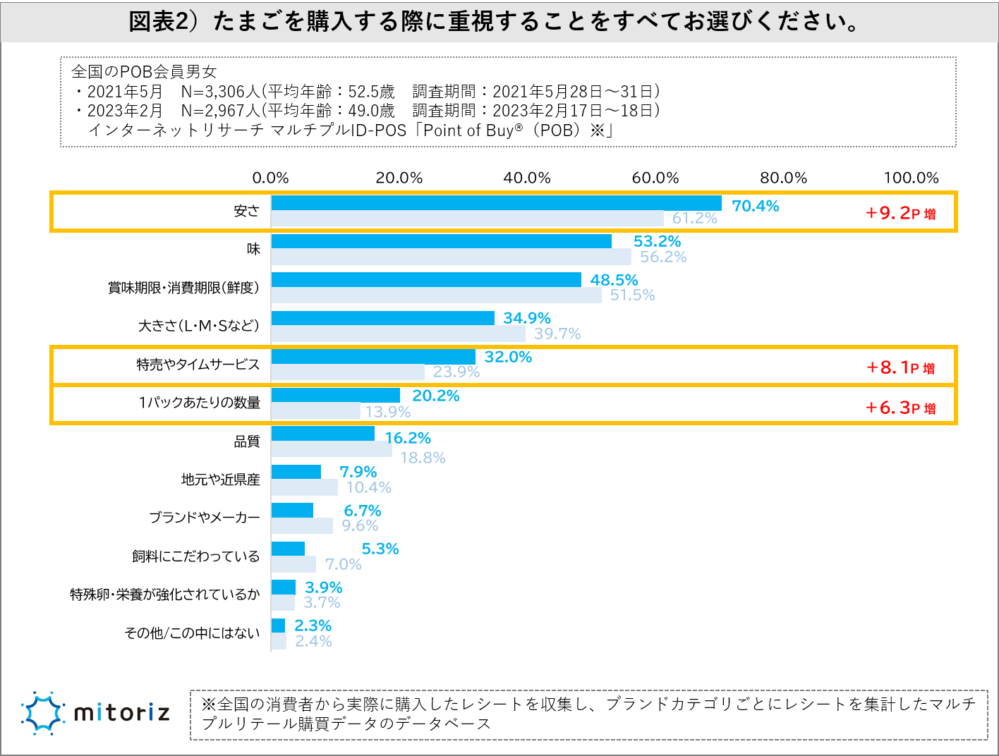 続いて「たまごを購入する際に重視すること」を尋ねたところ、「安さ(70.4%)」が最も多い回答となり、次いで「味(53.2%)」、「賞味期限・消費期限(鮮度)(48.5%)」という結果となりました。前回調査からの伸び率でみると「安さ(+9.2P)」、「特売やタイムサービス(+8.1P)」、「1パックあたりの数量(+6.3P)」が上位を占めており、以前よりも「価格」や「数量」を重視する人が増加傾向にありそうです(図表2)。