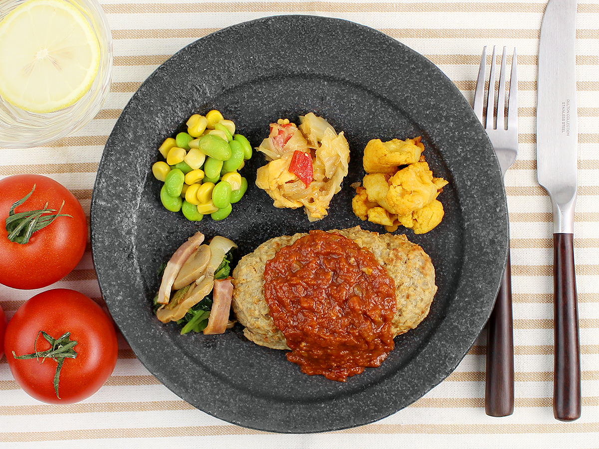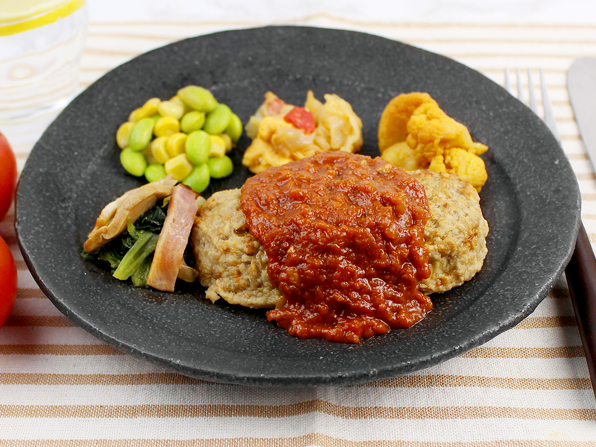 コク深いトマトデミグラスソースで、優しい味わいのハンバーグに仕上げました。鶏肉のやわらかなハンバーグで、パン、ライスどちらでも相性の良いプレートとなっております。付け合わせに、ほうれん草とマッシュルームのソテーを添えました。