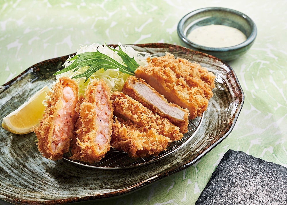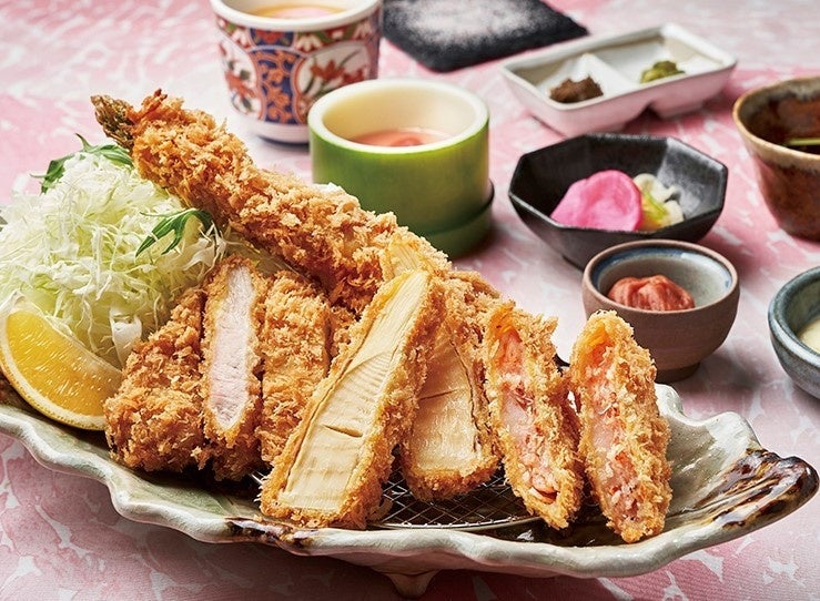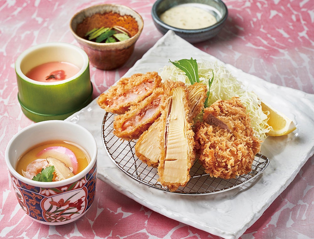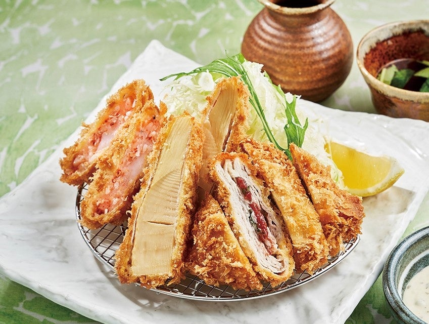 梅の香りがふわっと広がる梅しそミルフィーユかつに、筍の肉巻きかつ、桜エビ・甘エビ・バナメイエビのプリプリ食感が自慢の海老かつを盛り合わせました。