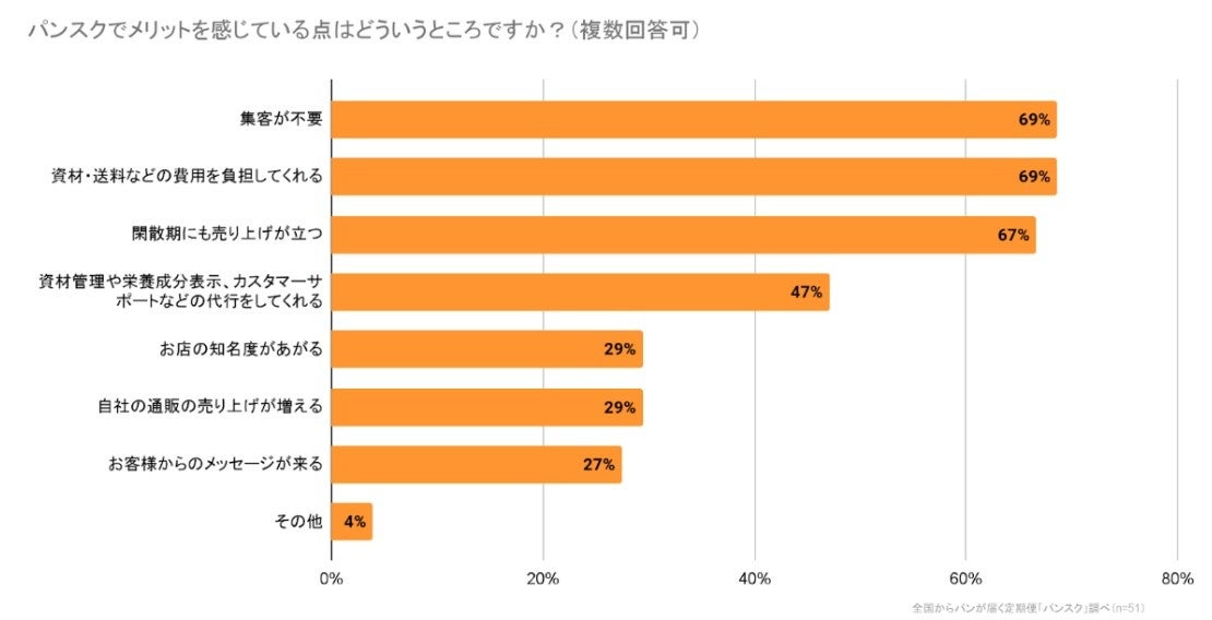 「パンスク」に参加するメリットを聞いたところ、「集客が不要」、「資材、送料などの費用を負担してくれる」という回答が最も多く、7割ほどの提携パン屋がメリットと感じていました。また、「閑散期にも売り上げが立つ」、「資材管理や栄養成分管理、カスタマーサポートなどの代行をしてくれる」がポイントととなっていることも判りました。