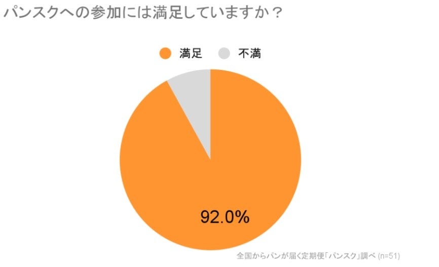 併せて、”パンスク会員”と、”パンスク提携パン屋さん”に対して「パンスクの満足度」に関する調査を実施し、ユーザー満足度88%、パン屋さん満足度92%という結果となり、双方から高い評価を得ていることが判りました。