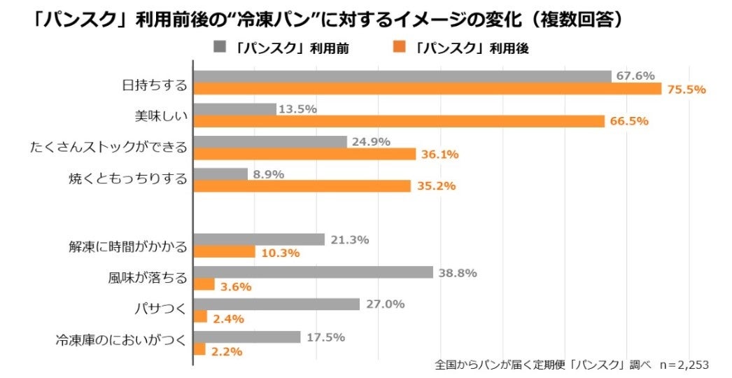 一方で、「風味が落ちる」「パサつく」「冷凍庫のにおいがつく」といったネガティブなイメージを持つ人の数は、「パンスク」を始める前に比べて、始めた後の方が減少しました。特に、「風味が落ちる」「パサつく」というイメージを持つ人の人数は10分の1以下にまで減少しており、「パンスク」を通して冷凍パンに対するイメージがポジティブに変化したことがわかります。