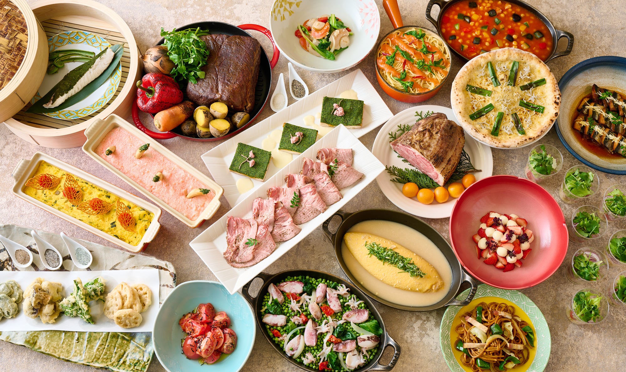 京都産牛肉や京丹波高原豚、京都産若鶏や、京都府亀岡市にある農畜産物直売所のファーマーズマーケットたわわ朝霧から届く野菜、京丹後産の塩やあかもくなど、京都の各地から厳選した地元の恵みをバイキングに使用しました。おばんざいやお茶、おぼろ豆腐など京都の食といえば連想される料理をはじめ、半兵衛麩よもぎ麩の天ぷらなど京都の名品を取り入れたメニュー、京都の春らしい桜をつかった料理など豊富なメニューが揃います。定番人気のローストビーフや握り寿司もございます。