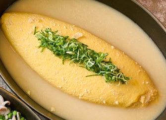 酒粕の凝縮された旨味やほのかな甘み、豊潤な香りが広がる酒粕餡を九条葱とともに、ふっくらと仕上げたシェフ特製オムレツにたっぷりかけてご提供します。