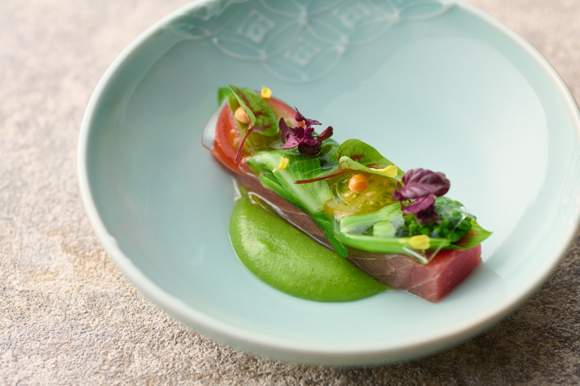 マグロと野菜、京都宮津のエキストラバージンオリーブオイルを、トマトから酸味や旨味のエッセンスを抽出した透明のシートで包んだニース風サラダはシェフからのご挨拶の一皿。シェフが工房の下見に行き、打合せを経て完成した洸春窯 有限会社洸春陶苑による京都の伝統工芸 京焼・清水焼の器でご提供します。京都の伝統工芸の器とフランス料理の組み合わせをご堪能いただける逸品です。