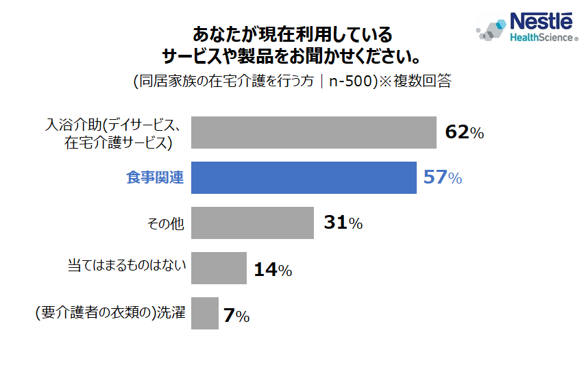 - 在宅介護者の約6割は食事に関する「外部サービスなどを利用」。