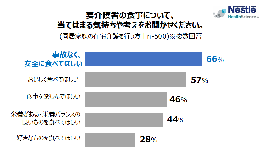在宅介護者に、“要介護者の食事”について聞いたとろ、1位「事故なく、安全に食べてほしい(66%)」、2位「おいしく食べてほしい(57%)」、3位「食事を楽しんでほしい(46%)」と“食の楽しみ”を“安全”が上回り、要介護者に安全に食事をとってほしいと考えている在宅介護者が多いことがわかりました【図3】。