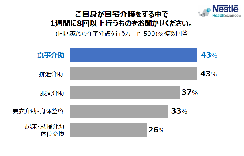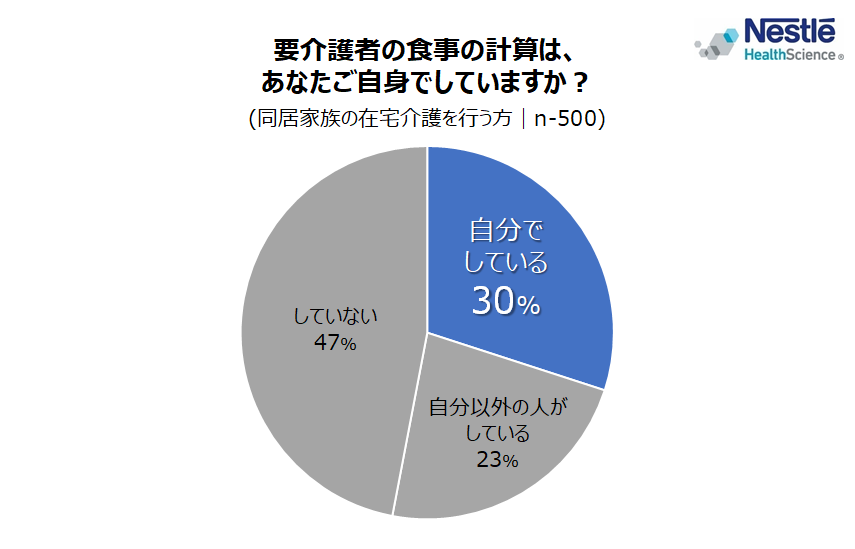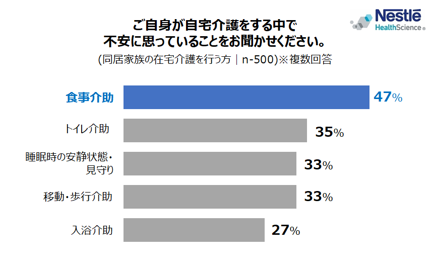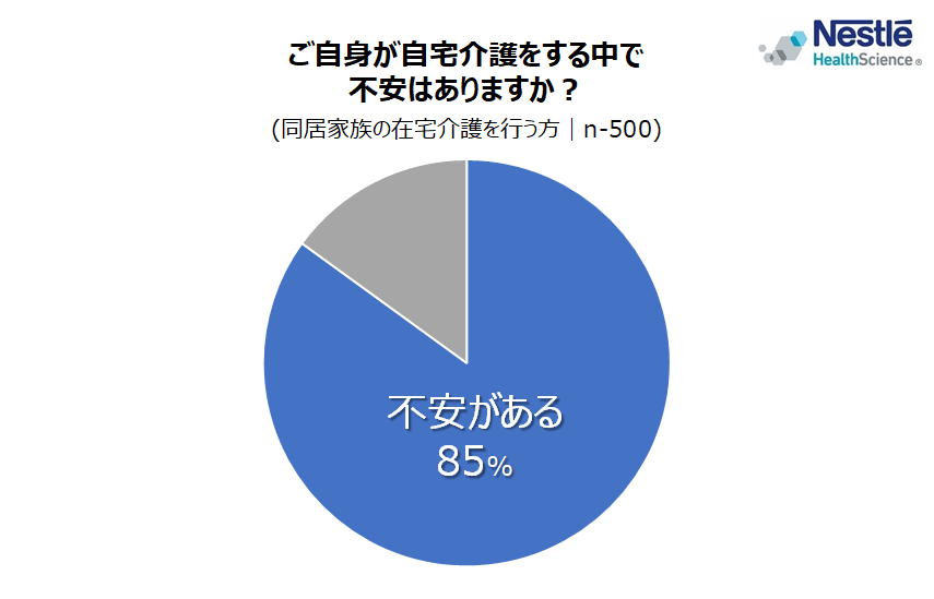 ネスレ日本株式会社 ネスレ ヘルスサイエンス カンパニー(本社: 兵庫県神戸市、カンパニープレジデント: 中島 昭広、以下「ネスレ ヘルスサイエンス」)は、同居家族の在宅介護を行う方(以下、「在宅介護者」)500 名を対象に、「在宅介護に関する調査」を実施しました。