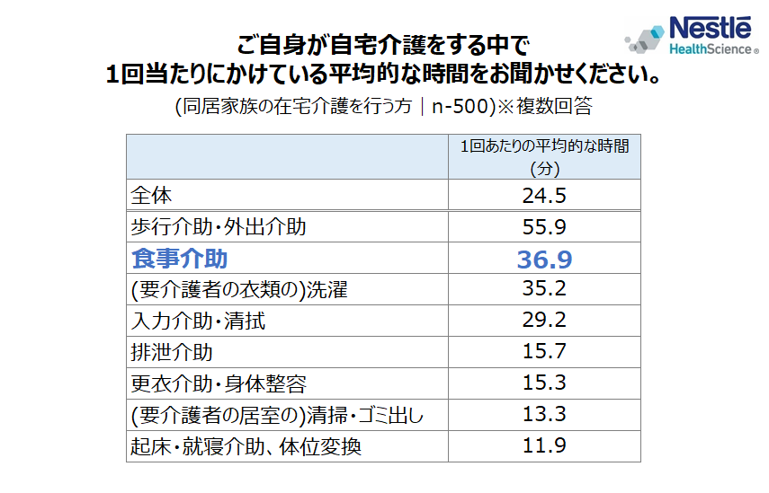 - 介護にかける時間は「食事介助(平均36.9分)」が、「歩行介助(平均55.9分)」に続き2位に。