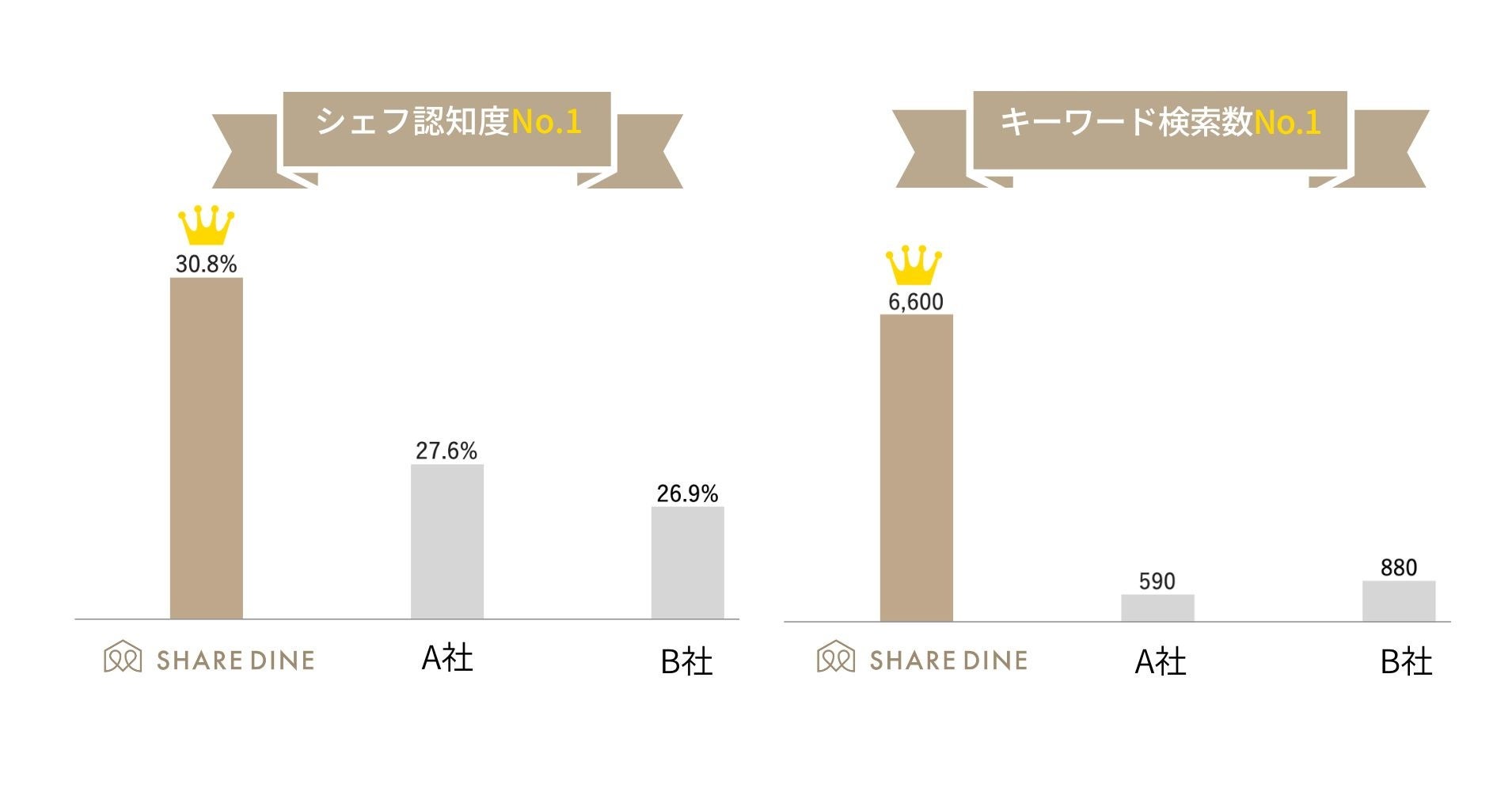 シェアダインは出張シェフサービス9社の中で、「シェフ認知度」「キーワード検索数」でそれぞれNo.1を獲得しました。