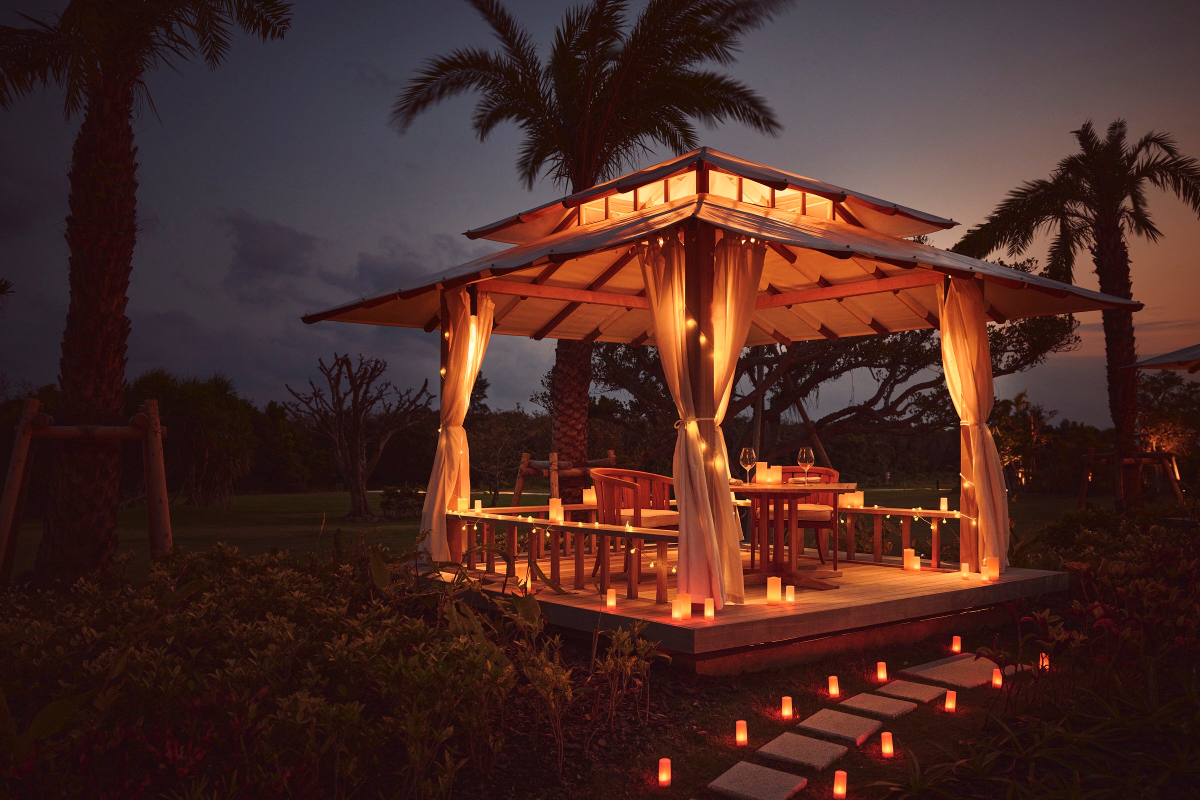 リゾートステイのハイライトはディナー。舞台となるサンセットプールは、夕暮れ時には空がオレンジ色に染まり、プールサイドを照らす幻想的なライティングで演出され、息をのむほどの美しさです。点在するカバナ(テントスタイルのプライベートスペース)にはディナーテーブルがセットされ、お二人のためだけのプライベートな空間が現れます。カバナは、海外の一流リゾートでは利用することがステイタスといわれるほど、ラグジュアリー体験をお約束するアイテムの一つです。一日最大で4組しか予約が取れないこの非日常な空間にて、大人の美食家にふさわしい、石垣牛や島魚、そしてユーグレナなど石垣島ならではの厳選食材で織りなすエレガントな6品のコースディナーをご用意します。