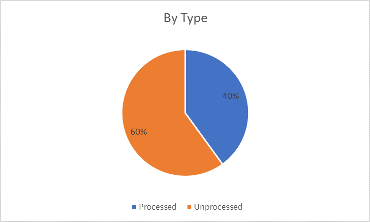回答: 調査中に、処理されたフォーム (40%) と未処理のフォーム (60%) が市場セグメンテーションを構成していることがわかりました。未加工のセグメントが最大の市場シェアを占めているため、製品の人気は、これらの食品に関連する新鮮な外観と利便性のために、過去 20 年間で急速に進化しており、これらの食品は栄養素が豊富でおいしいため、消費者は未加工の食品を好みます。