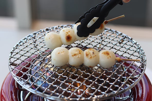 おこめぢゃやのだんごの白生地をご自身で専用のコンロで焼いて、付属のタレをお好みで付けて食べていただくことができる、体験型カフェメニューです。