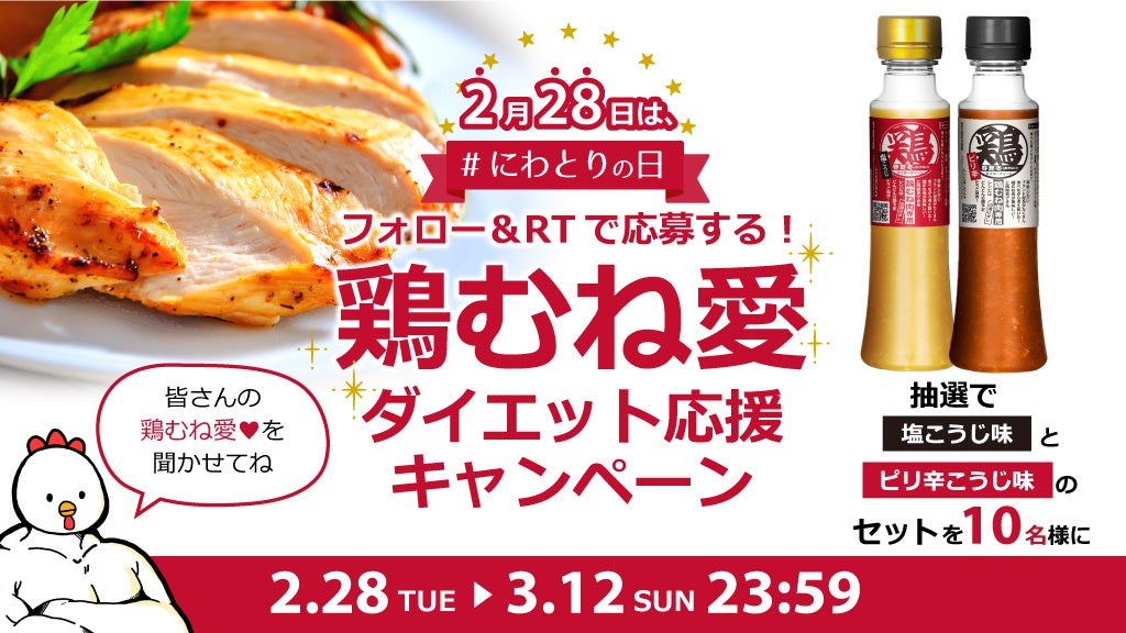 暦の上ではもう立春。これから暖かな春に向かうに連れて、服装も薄着になり、そろそろダイエットをはじめようとする方も多いのではないでしょうか?昨今の健康志向の高まりから鶏肉の消費量も増えていると言われています。特に脂質が低い鶏むね肉を愛してやまない方、鶏むね肉ダイエットを頑張っている方を称えるべく、鶏むね愛エピソードを募集します。