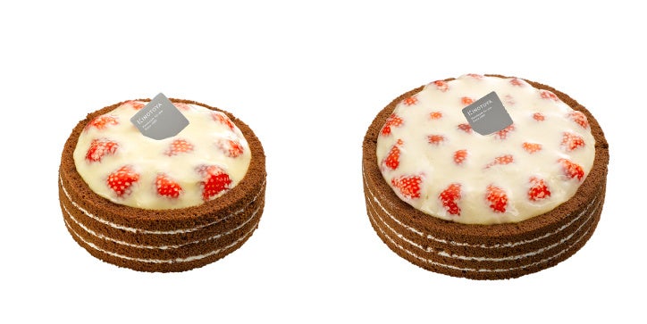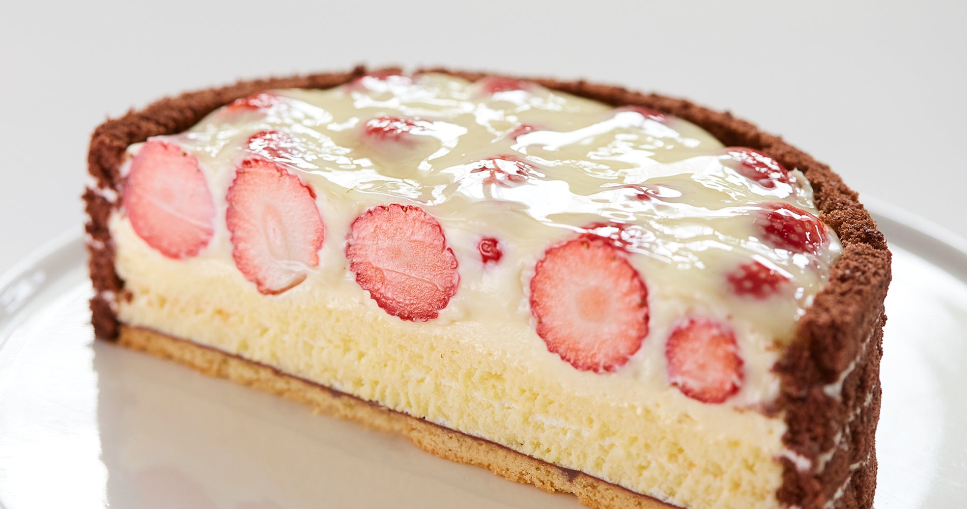 春のおいしいイチゴをまるごとぎっしり敷き詰め、上に特製カスタードクリームを重ね、とろける口どけのババロアとしっとりスポンジ、底にサクサクのクッキー、周りをココアスポンジで包みました。