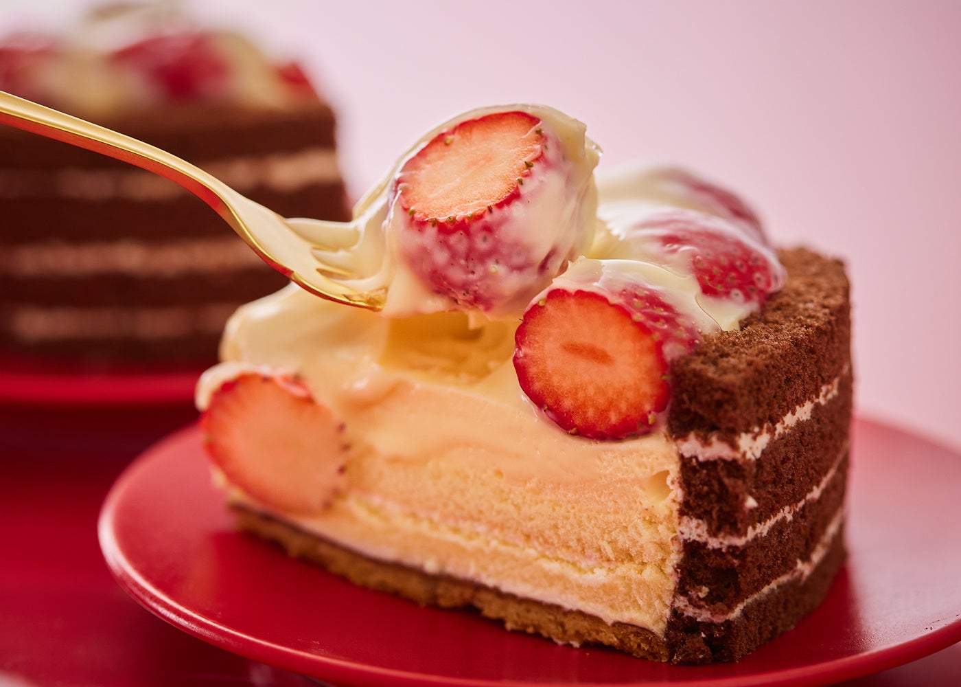 どこをカットしてもイチゴがいっぱいのわくわくするまるごとイチゴのボリューム感やフレッシュなシズル感。
