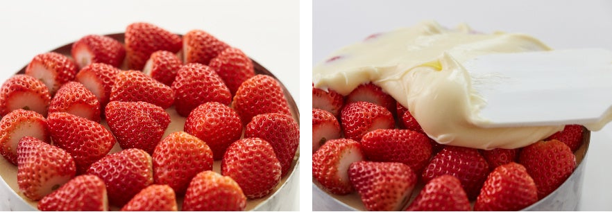 イチゴの爽やかさと、クリーミーなババロア、甘さ控えめなやさしい風味のカスタードクリームが口溶けよく広がり、全ての味わいが絶妙な相性で際立ち、一体となって印象的なおいしさを奏でます。