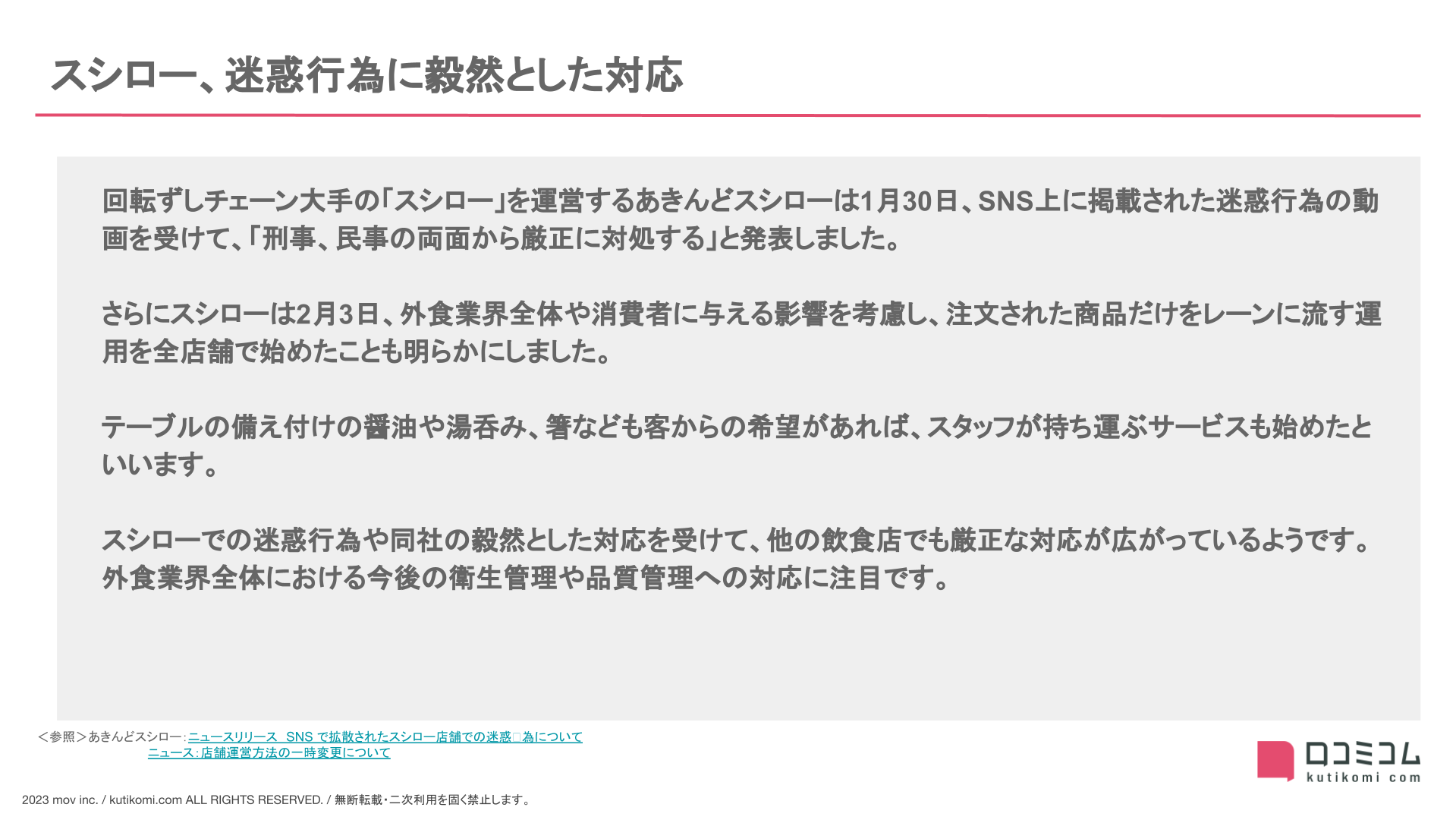 2023年1月はスシローがSNS上の迷惑行為に毅然とした対応をとったことが話題となりました。また、訪日外国人消費がコロナ前の5割にあたる5,952億円まで回復し、日本人宿泊数は「コロナ前超え」するなど、順調にインバウンド回復やコロナ明けの消費に期待がもてるニュースが続きました。