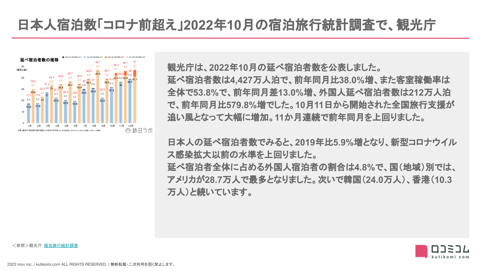 日本人宿泊数「コロナ前超え」2022年10月の宿泊旅行統計調査で、観光庁