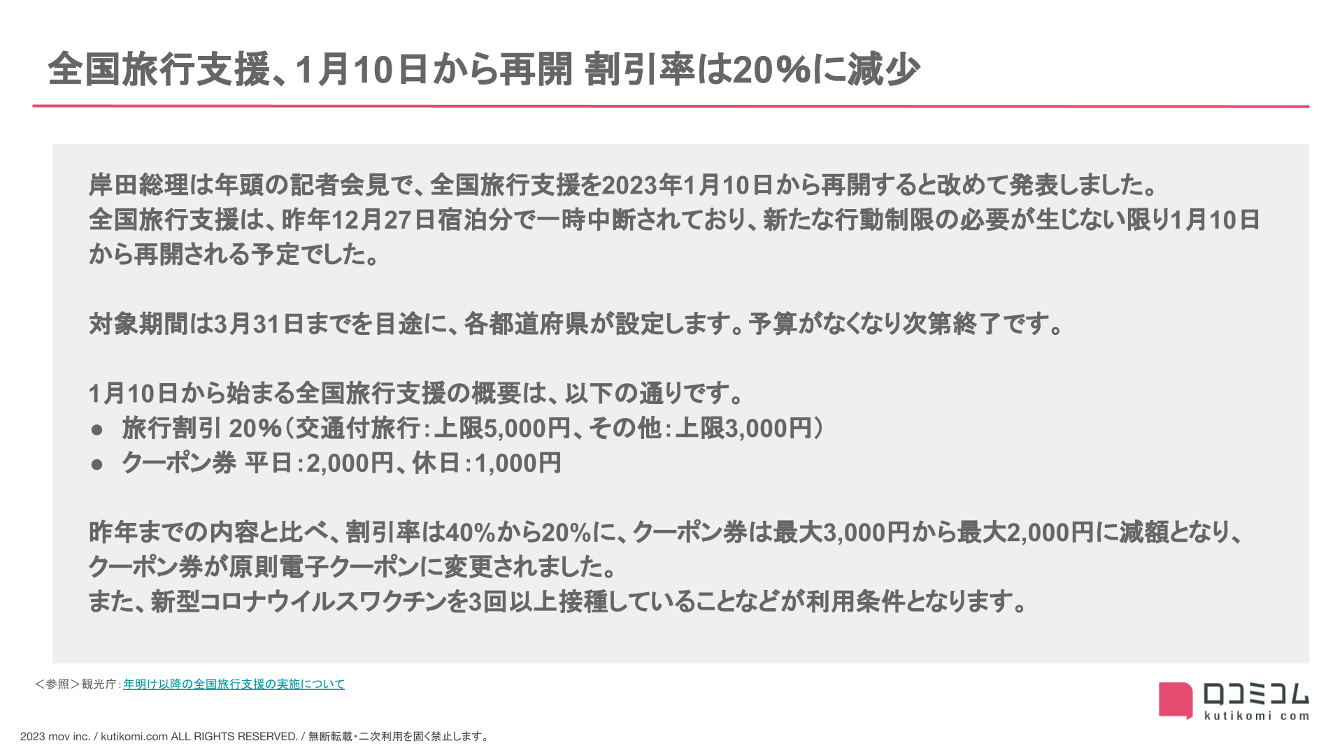 ■ 宿泊・観光業界動向まとめ:全国旅行支援、10日から再開 / 日本人宿泊数「コロナ前超え」他