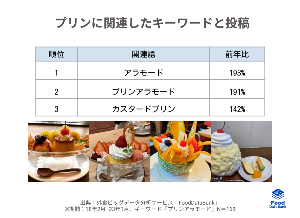 プリンに関連したキーワードに注目してみると、1位と2位ともにプリンアラモードに関連したキーワードがランクインしていました。昭和レトロブームからレトロ喫茶の人気が高まり、レトロプリンだけでなく見た目が華やかで贅沢感を堪能できるプリンアラモードの人気も高まっているようです。横に長い器でプリンやその他の具材が見えるものが一般的ですが、中には器ごとフルーツを活用して更に贅沢感を出したものも登場しています。また、プリンアラモード味としてサンドイッチやクレープ、かき氷への派生も見られました。