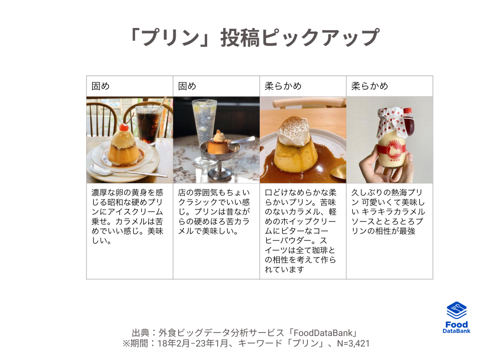 固めプリン、柔らかめプリン以外に、両者のハイブリット系プリンのレビューも見て取れました。特徴としては、見た目は近年注目が集まるレトロ系プリンでありながら、食感は柔らかい平成プリンであったり、固すぎず柔らかすぎないねっとりとした新たな食感を作り出していたりと、両者の良い点を組み合わせて進化しているようです。