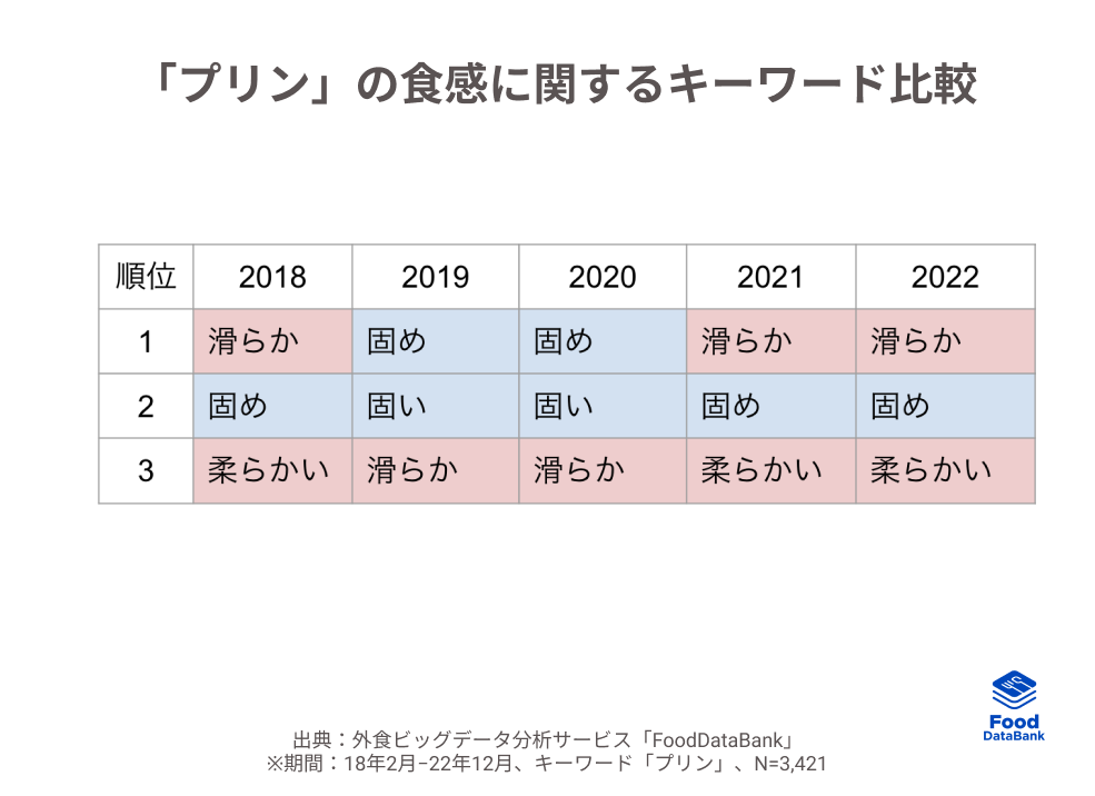 注目度比較から、プリンを食べる際に最も注目される割合の高い要素は「食感」であることが分かります。また、食感に関するキーワードをさらに深ぼっていくと、直近の約5年間では「固め」「滑らか・柔らか」の2種類の食感が首位を争っていることが見て取れます。