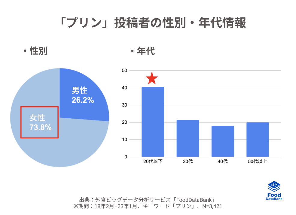 外食ビッグデータ分析サービス「FoodDataBank」から、「プリン」投稿者の性別と年代について見ていくと、女性が7割を占め、年代では20代以下が最も多いことが分かりました。