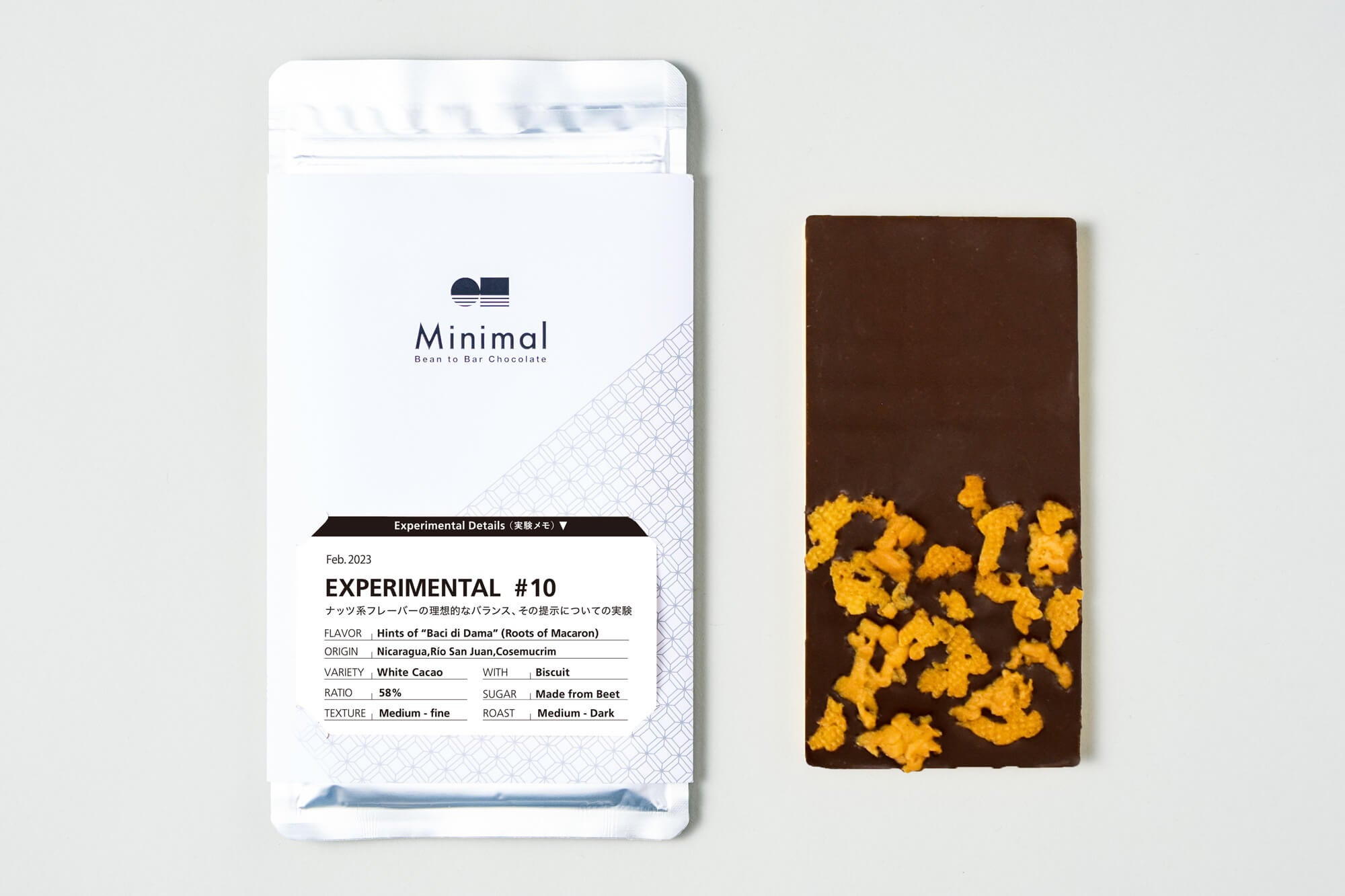 株式会社βace(東京都渋谷区、代表取締役:山下貴嗣)が展開する、日本発のスペシャルティチョコレート専門店 「Minimal – Bean to Bar Chocolate – (ミニマル)」(https://mini-mal.tokyo/)は、希少なホワイトカカオを使ったチョコレートにビスケットをトッピングし、ナッツ系フレーバーの理想的なバランスの表現を企図した「EXPERIMENTAL #10」をオンラインストア・富ヶ谷本店にて3月1日より発売します。イタリアの伝統的な焼き菓子「バーチ・ディ・ダーマ」のような味わいで、ホワイトデーのギフトにもおすすめの1枚です。