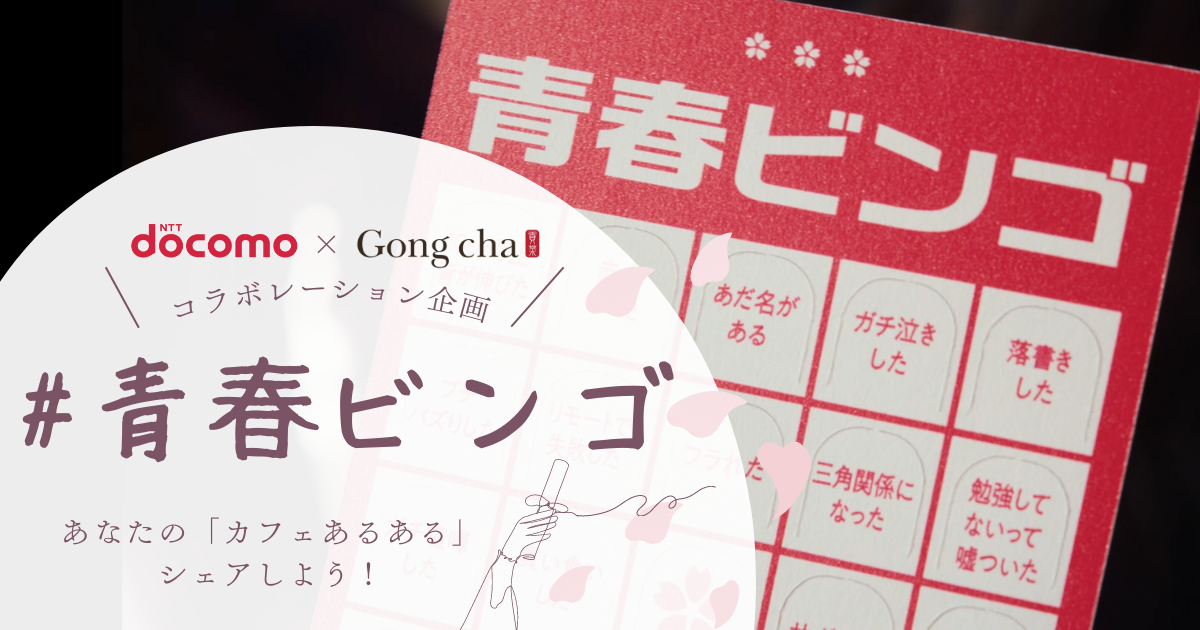 株式会社ゴンチャ ジャパン(本社:東京都港区、代表取締役社長:角田淳、以下ゴンチャ)は、株式会社NTTドコモ(本社:東京都千代田区、代表取締役社長:井伊基之、以下ドコモ)が展開する「ドコモ青春割」の一企画「青春ビンゴ」とコラボレーションし、2023年3月4日(土)よりゴンチャ4店舗にて学生の「青春ビンゴ」を配布するキャンペーンを実施いたします。また本日、ゴンチャ公式Twitterアカウントの投稿にて、「青春ビンゴ カフェ篇」のデータも配信いたします。この春卒業する学生の皆様が、「青春ビンゴ」を通してカフェでの思い出を振り返りつつ、最後の青春のひとときを楽しんでいただく機会となれば幸いです。