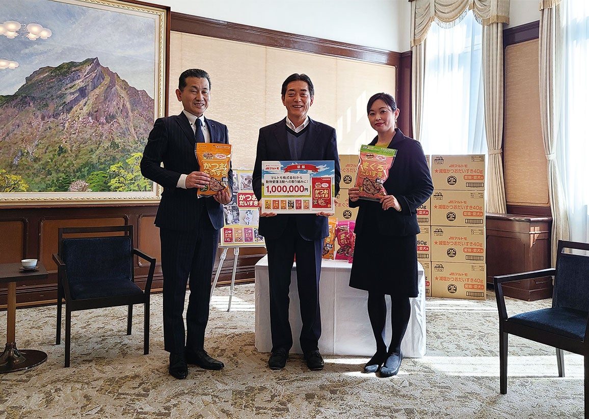 マルトモは、以前より「愛媛県動物愛護サポーター」に登録しておりましたが、地元である愛媛県の犬・猫殺処分数が全国の地方自治体と比較して多く、同県の企業として地方自治体の殺処分数削減に向けた取り組みに何か力になれることがないかという想いから、商品の売上げの一部を寄付し、支援を行うことを決定。このたび、2月22日に第一回目の寄付贈呈を行いました。今回の寄付で終わりではなく、これからも犬・猫殺処分数削減に向けた具体的な取り組みを愛媛県と協議して行く予定です。