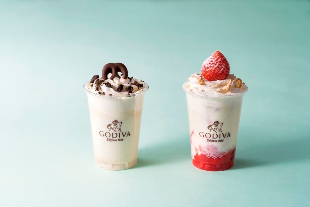 GODIVAデザートドリンクに、「キリ」との初のコラボレーションから誕生した「GODIVAデザートドリンク チーズケーキ」と、日本上陸50年を迎えたゴディバ ジャパンと、創立50年を迎えた全国農業協同組合連合会(以下、全農)との共同プログラム「GODIVA×全農 コラボレーションプロジェクト」のコラボレーション商品「GODIVAデザートドリンク ストロベリーショートケーキ」が登場します。