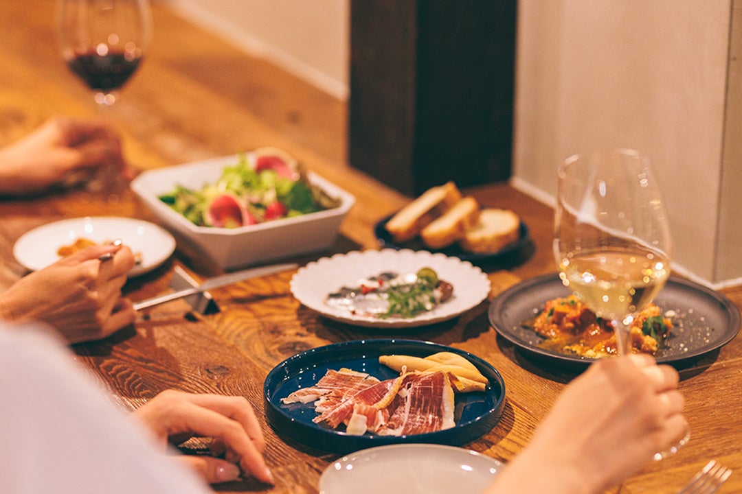 「ricont(リコント)」は、福岡市西区旧唐津街道沿いの福岡市登録文化財である150年の歴史を持つ古民家を改装し、柱や梁・天井は当時のままに、壁や床をシンプルに仕上げた歴史と現代が融合した新しい空間で、姪浜や糸島の素材を使用した本格スペイン料理とワインを気軽にお楽しみいただけるスペインバルです。歴史を刻んできた柱や梁、有田で作られた器や美しく輝くグラスと料理が主役となるよう、店内はあえてシンプルな空間に仕上げました。建物・食・器のコントラストをぜひお楽しみください。