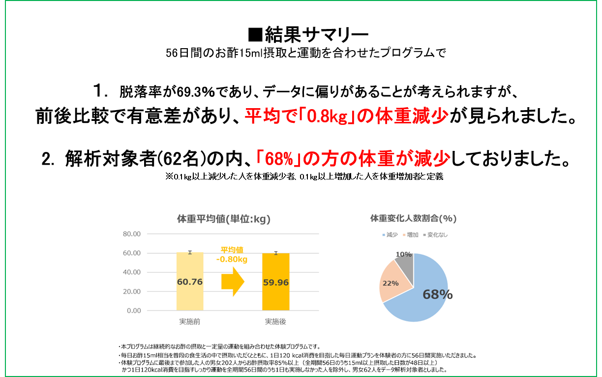 約2か月間、お酢15mlの摂取と運動を合わせたプログラム(1日120 kcal消費を目指した運動)を実施し、