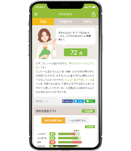 食事を記録すると、すぐに栄養計算・アドバイスが表示されます。食生活改善のプロフェッショナル管理栄養士のノウハウとAI技術を組み合わせたアドバイスがユーザーの行動変容を促します。