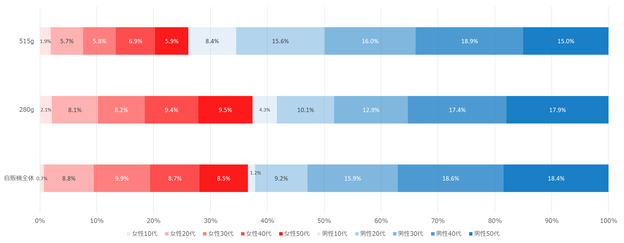 昨年の時間帯別購入本数比率のデータを見ると、大容量タイプは始発から8時までが人気となっています。朝食代わりにという方もいれば、朝買って一口、オフィスの冷蔵庫に入れて休憩中に一口、と分割飲みしている方もいるのかもしれません。また、全体と比べて男性10代層の購入比率が非常に大きく伸びており、男性の10代と20代で全体の約1/4と大きな割合を占めていることがわかります。