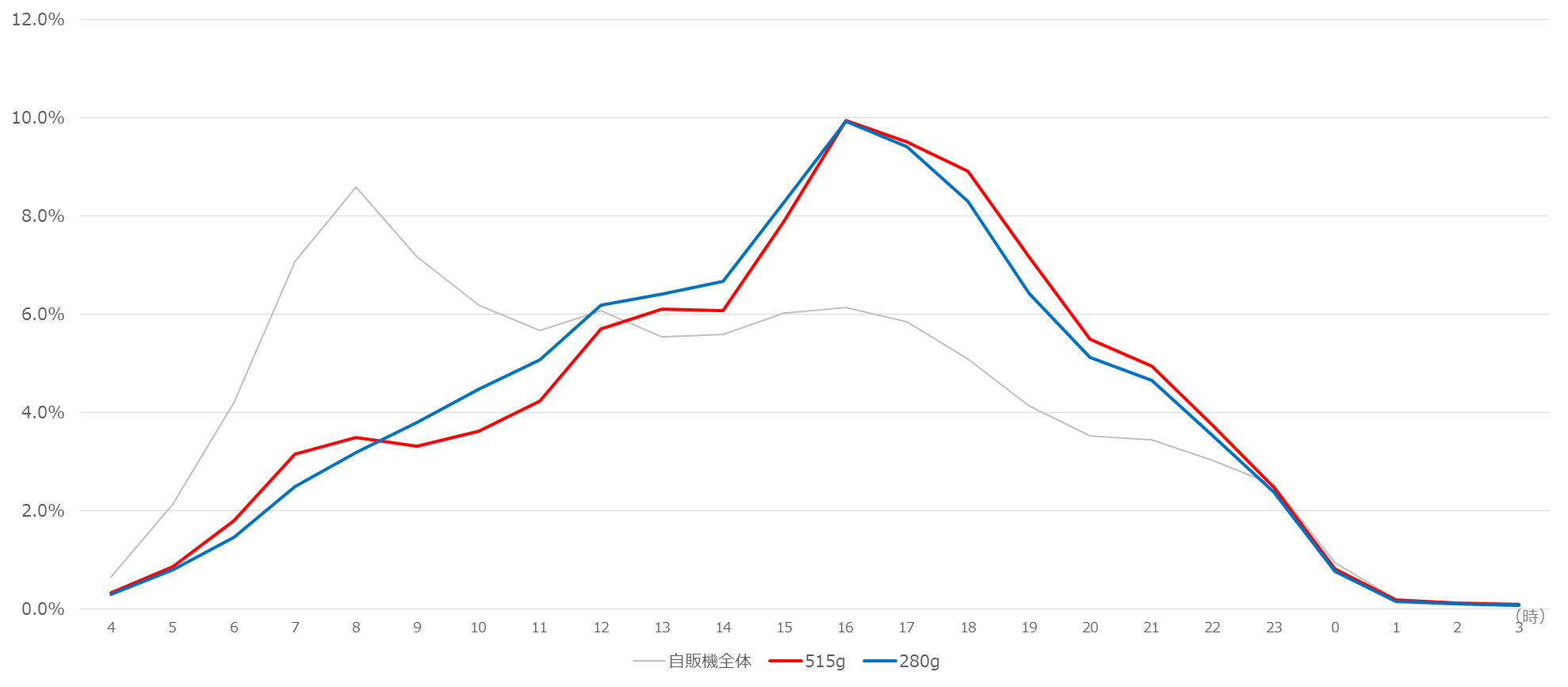 アキュアの自販機全体で見ると、女性の購入比率は約36%。一方で、天然水ゼリーの小容量タイプは約37%となっており、わずかではありますが自販機全体を上回る結果となりました。特に大容量タイプと比べるとその比率は顕著に高くなっています。また、時間帯を見ても、間食用や爽快感を求める際に飲用されているのではと捉えています。