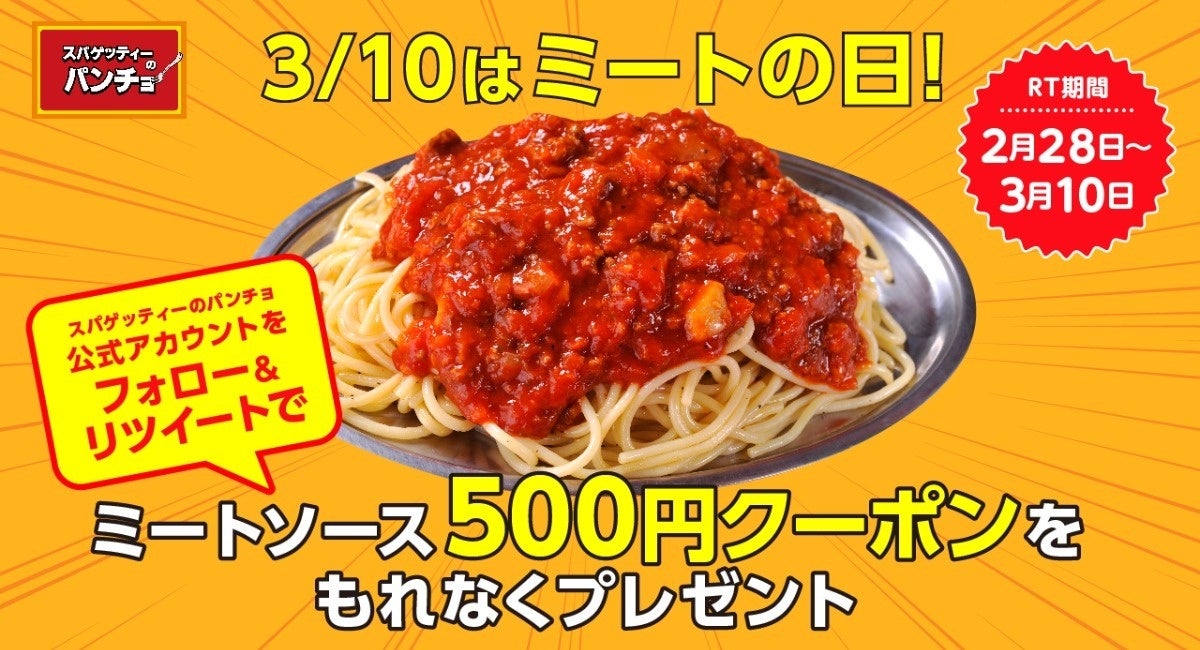 年に1度の「ミートの日」。2023年2月28日(火)〜3月10日(金)の期間中『スパゲッティーのパンチョ』公式twitterアカウント(@napopancho)をフォローの上、引用リツイートしてくださった方へ「ミートソース」が500円(税込)になる特別クーポンをプレゼントします。