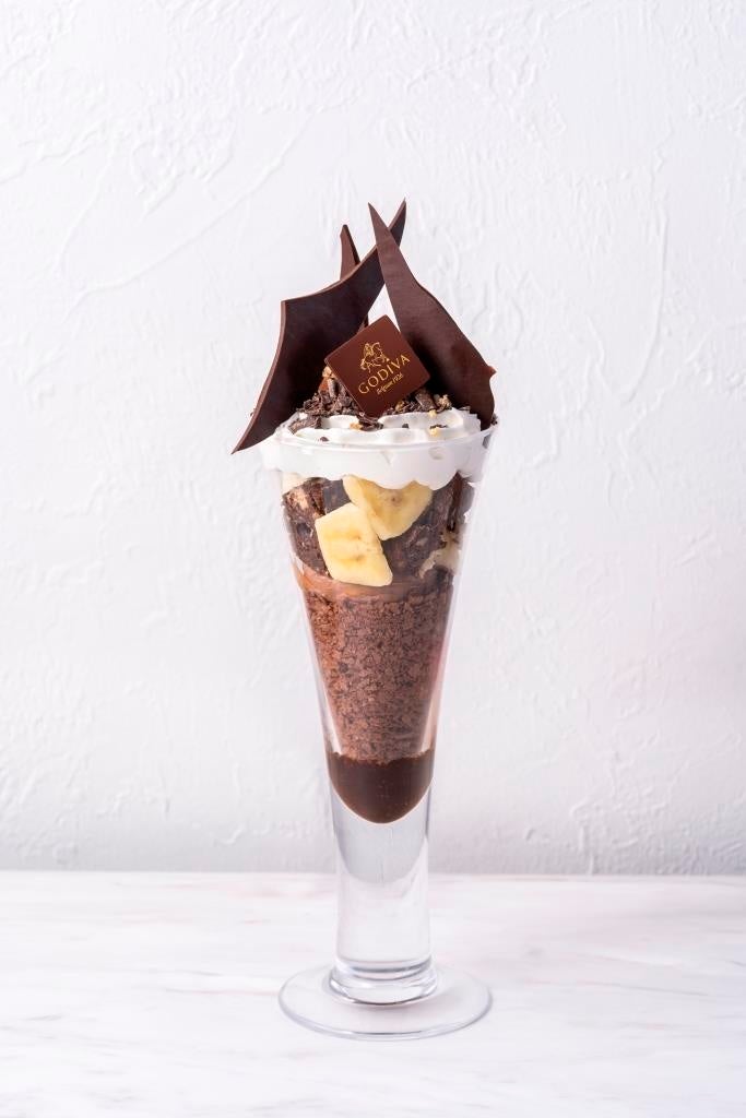 ゴディバオリジナルガトーショコラを使用したバナナチョコレートパフェです。ガトーショコラやバナナ、フィアンティーヌ、チョコレートプレート、アイスクリーム、カカオニブなど、食感の異なる様々なカカオの食材を組み合わせることで、最後の一口までリッチなチョコレートテイストをお楽しみいただけます。