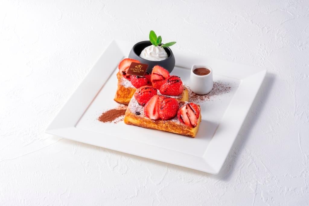 旬の苺をのせた、生クリームたっぷりのアパレイユに浸したデニッシュのフレンチトーストです。苺の上品な酸味とゴディバのダークチョコレートソースのペアリングをお楽しみください。