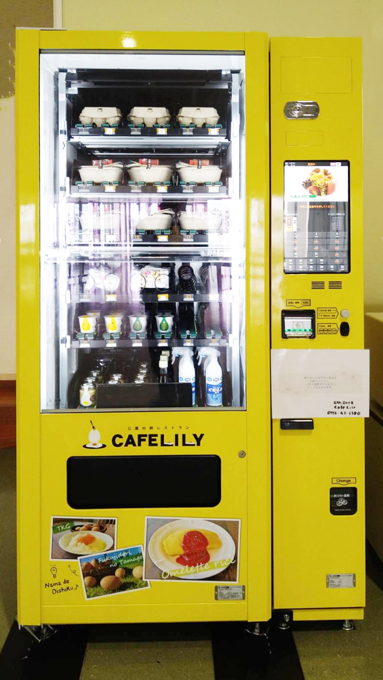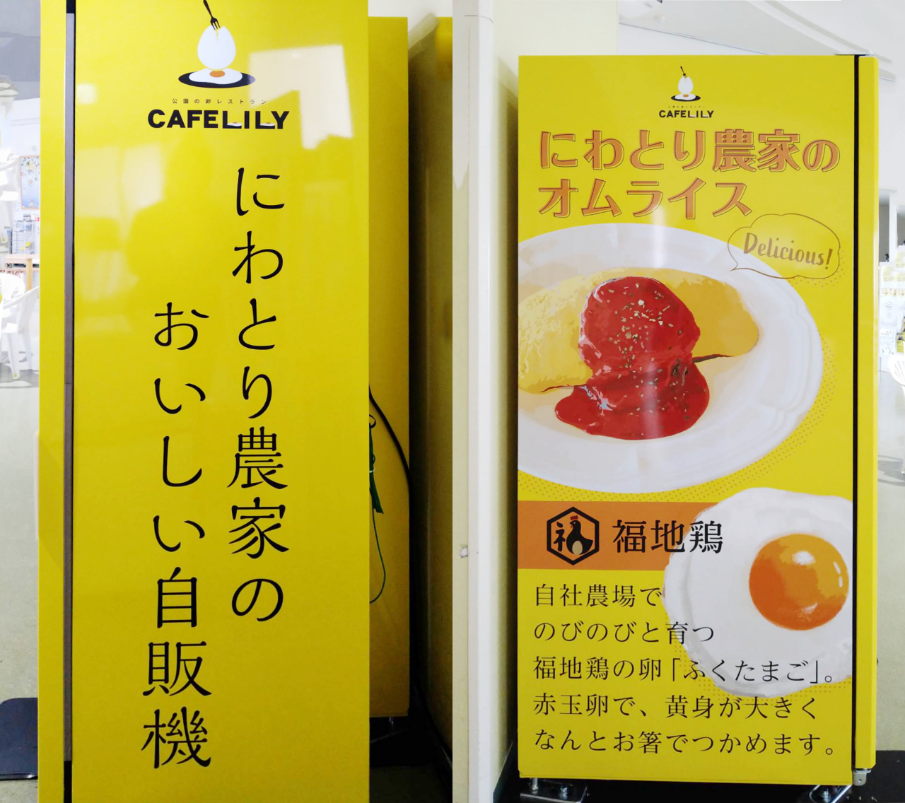 福井県坂井市のゆりの里公園内にある「朝採りたまごダイニングリリー」は、自然の中でのびのびと育ったブランド鶏、福地鶏から採れた卵を使った料理が自慢のカフェレストランです。同店は、自然な食材や調味料、新鮮な卵など、素材の良さを追求し、さまざまなお料理を提供されています。その中でも人気のオムライスをゆりの里公園に来た方向けに自動販売機で提供できないかと検討し、自動販売機を導入することになりました。