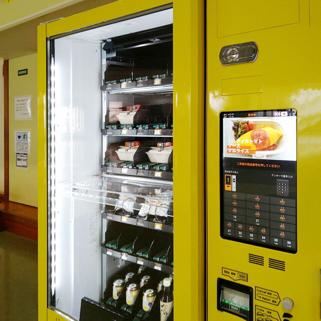 自販機には、看板商品である福地鶏の採れたて卵を使用したオムライスをはじめ、トマト、プリン、卵などがラインナップされています。特に、福地鶏の卵を使用したオムライスは、卵本来の濃厚な風味や味わいを存分に楽しめる逸品です。自販機のラッピングは全体が黄色で統一され、美味しそうなオムライスの写真が配置されています。液晶部分では販売されているオムライスの実際のお写真をスライドショーでご覧になって頂くことが可能です。