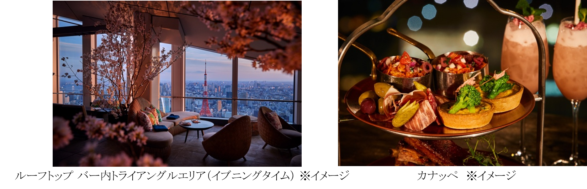 アンダーズ 東京の最上階、52階に位置する「ルーフトップ バー」のテラスには、毎年好評の「桜ガーデン」が今年も登場。お花見と東京の絶景が一度に楽しめる唯一無二のロケーションで、「ペリエ ジュエ グラン ブリュット」をグラスで愉しみながら、満開の桜をイメージした華やかなセイボリーやスイーツを愉しめる「桜ガーデンアフタヌーンティー」を週末限定でご用意。また、イブニングタイムには、地上約250mからの煌めく夜景と共に夜桜を堪能できる贅沢な空間で、『ペリエ ジュエ』とシェフ特製メニューのマリアージュが愉しめる「夜桜プレミアムビュープラン」を提供いたします。「夜桜プレミアムビュープラン」では、心ゆくまでシャンパーニュを堪能できるフリーフロープランもご用意いたしました。