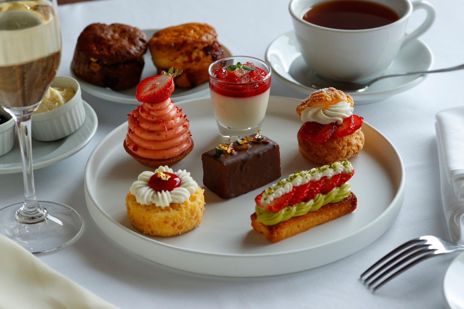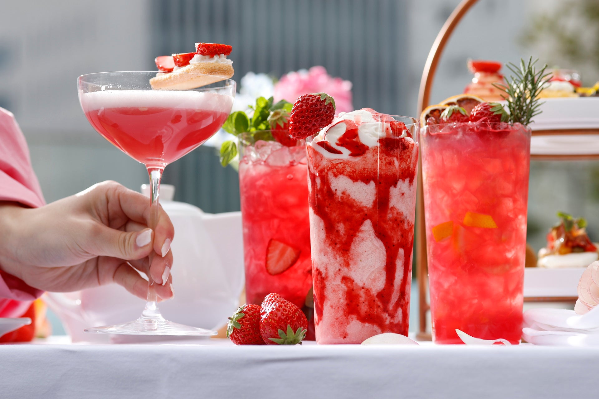新たに開始する「Strawberry Afternoon Tea」には季節のいちごをふんだんに使用したピスタチオクリームといちごのタルトやいちごのシュークリーム、いちごのモンブランなどのスイーツ6種とともに、イル・ルピーノ・プライムが誇るUSDAプライムビーフ※のチーズバーガーや、シグネチャーメニューとしても人気の高いモッツアレラのカプレーゼなどのセイボリー6種をご用意いたしました。お飲み物はドイツ生まれの最高級品質の「ロンネフェルト」の紅茶やコーヒー各種からお選びいただけます。またいちごのピニャコラーダやモヒートなどのカクテルやモクテルも登場し、飲み物までいちごづくしなひと時をお楽しみいただけます。