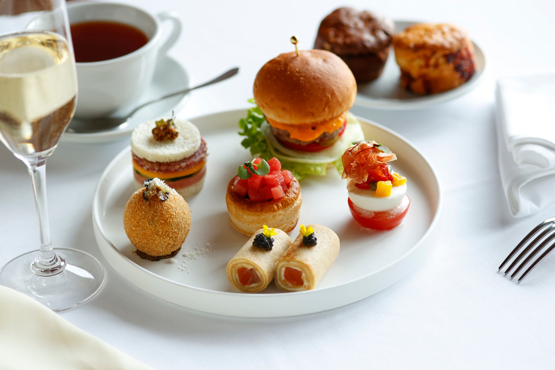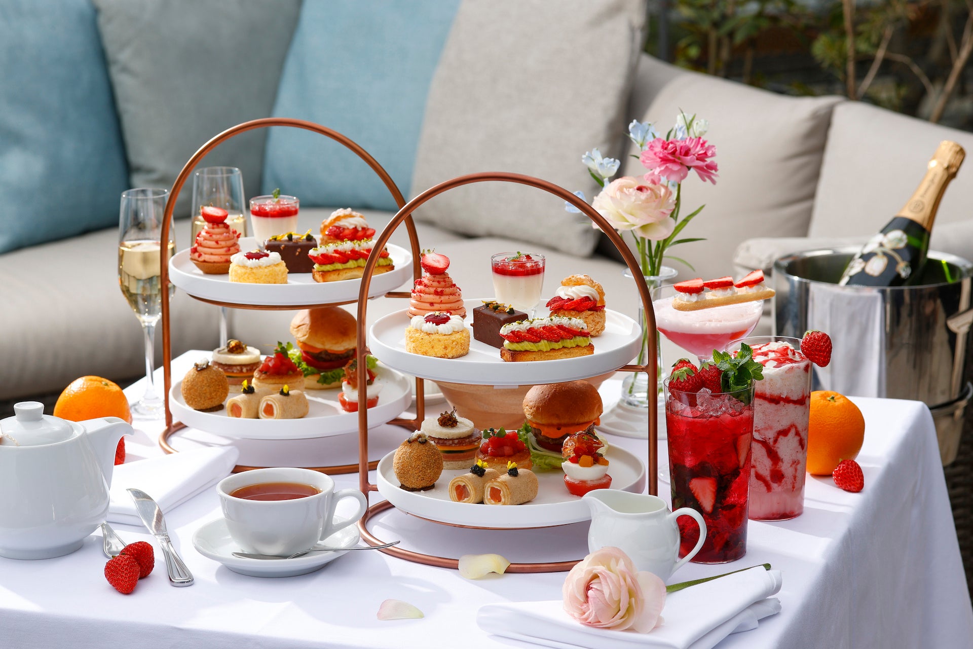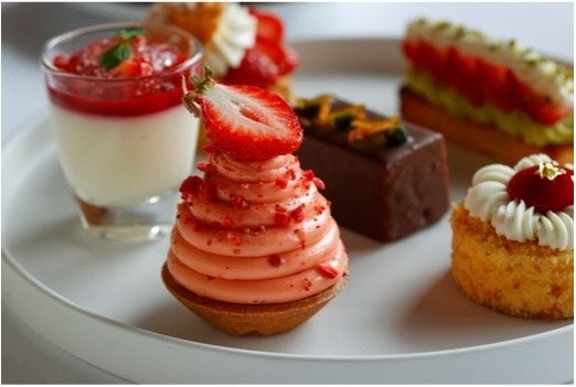 新たに開始する「Strawberry Afternoon Tea」には季節のいちごをふんだんに使用したピスタチオクリームといちごのタルトやいちごのシュークリーム、いちごのモンブランなどのスイーツ6種とともに、イル・ルピーノ・プライムが誇るUSDAプライムビーフ※のチーズバーガーや、シグネチャーメニューとしても人気の高いモッツアレラのカプレーゼなどのセイボリー6種をご用意いたしました。お飲み物はドイツ生まれの最高級品質の「ロンネフェルト」の紅茶やコーヒー各種からお選びいただけます。またいちごのピニャコラーダやモヒートなどのカクテルやモクテルも登場し、飲み物までいちごづくしなひと時をお楽しみいただけます。