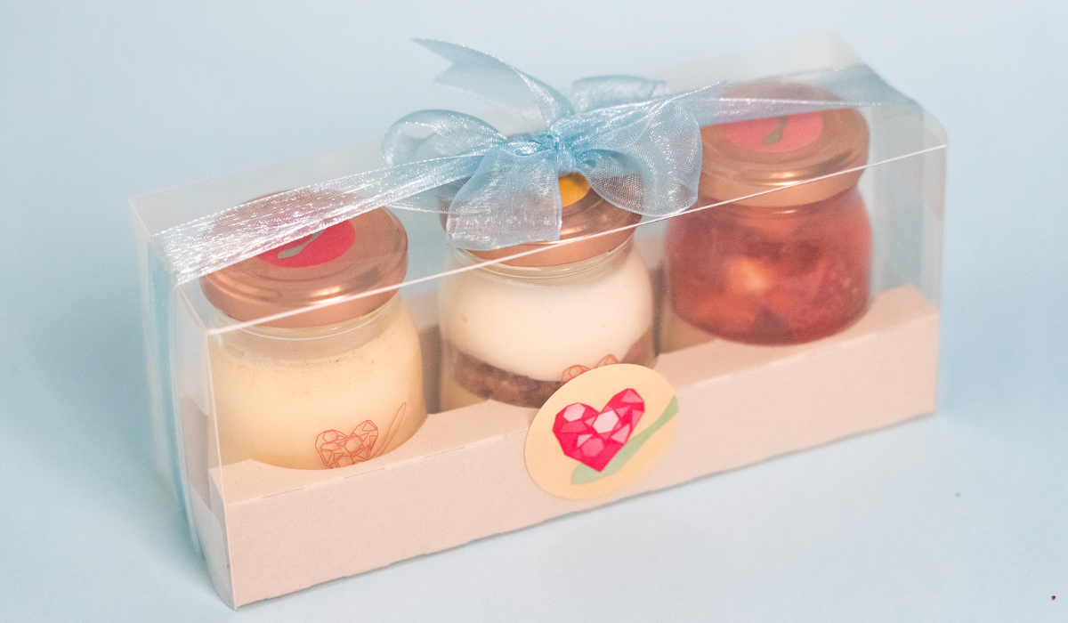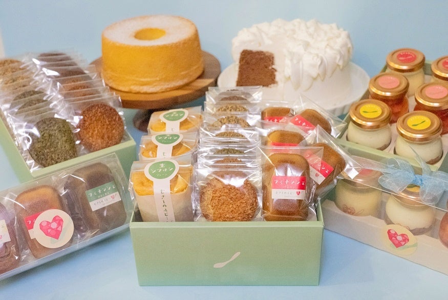 ラインナップはプリン(ボトルスイーツ)、シフォンケーキ、フィナンシェなど。⽶粉を使⽤しているため