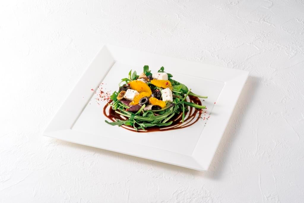 ベビーリーフやセルバチコに、フェタチーズとドライいちじく、オレンジの果肉をトッピングしたヘルシーサラダです。バルサミコクリームと合わせてお召し上がりください。