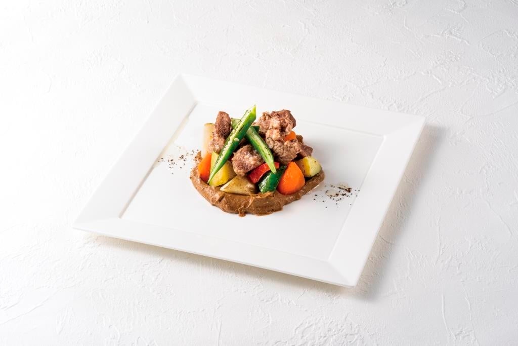 牛タンと色とりどりの温野菜を、カレーソースで食べる温かいサラダです。